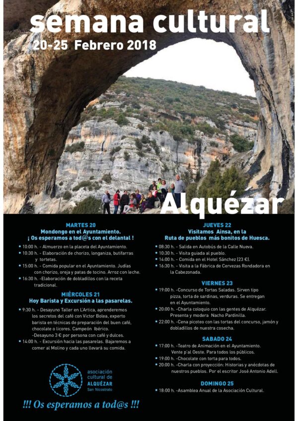 A partir del día 20 de febrero empieza en Alquézar la Semana Cultural, con muchas actividades que os dejo a continuación detalladas. Destacar por la parte que nos toca que el miércoles día 21 de febrero, Victor Bolea nos acompañará en Panadería L´Artica, es un experto barista en estas técnicas de preparación del buen café, chocolate o licores, bebidas espirituosas…etc…